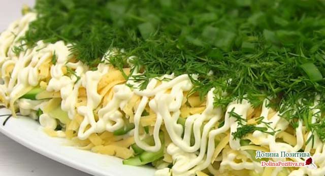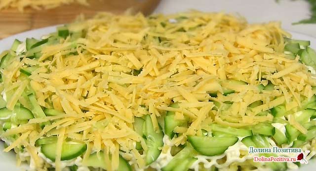 Свіжий огірок наріжте тонкою соломкою, викладіть на картопляний шар. Шматок твердого сиру крупно натріть. Розмістіть тонким шаром на поверхні салату. Нанесіть сіточку з соусу.