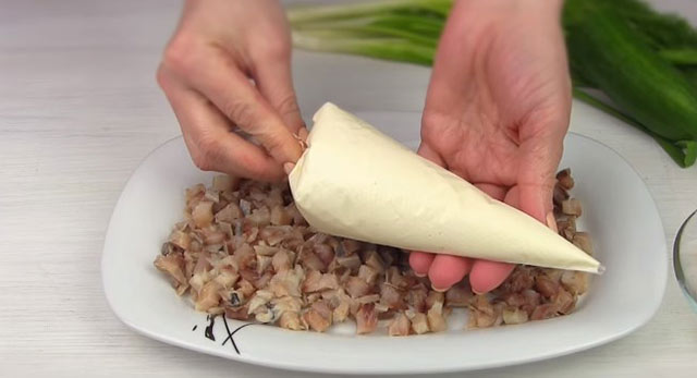 Філе очищеної оселедця наріжте на дрібні шматочки. Викладіть на тарілку в якості першого шару. Покрийте майонезній сіточкою. Її зручно наносити за допомогою спеціального кулінарного пакета або звичайного целофанового мішка з обрізаним куточком.