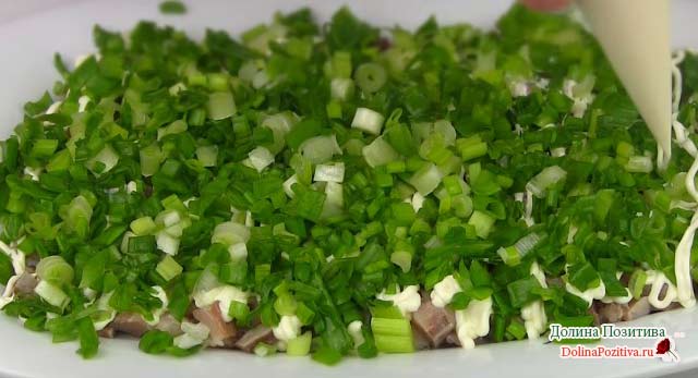 - Цибуля відокремте від рідкого маринаду. Рівномірно розподіліть по поверхні салату. Трохи ущільніть, змастіть майонезом.