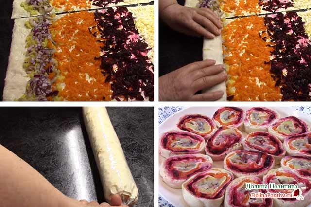 У представленому нижче рецепті звичні інгредієнти сервіровані у формі рулету. Таке блюдо виграшно виглядає на святковому столі і зручно ділиться на порції. Як правило, його не солять. Хоча при використанні слабосоленої риби овочеві шари можна злегка приправити.