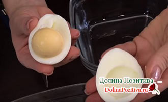 Зварені круто яйця очистіть від шкаралупи. Надріжте посередині і розділіть на дві половинки. Вийміть жовтки, відкладіть в окремий посуд, розкришите виделкою.