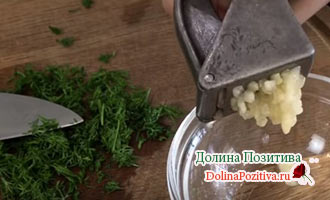 Часник вичавити через прес, кріп дрібно порубаєте ножем. З’єднайте.