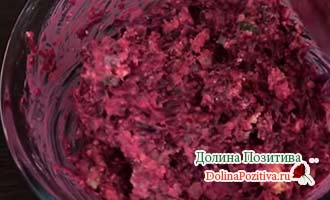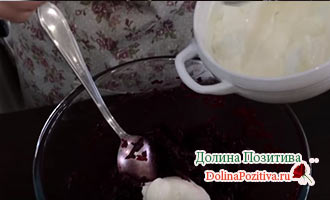- Подрібніть варений буряк, блендером доведіть до пюреобразного стану. Додайте дві столові ложки майонезу, злегка збийте блендером. Приєднайте остиглий желатин, знову збийте.