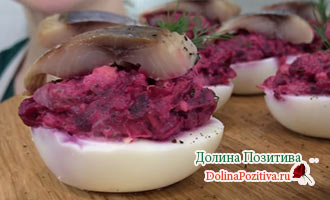 Начиніть приготованим салатом половинки яєчних білків, злегка присипте меленим перцем. Кожну накрийте скибочкою оселедця, прикрасити листочком свіжої зелені. Оселедець під шубою для ледачих готова!