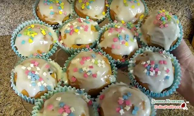 Заповнюємо 1/2 ємності тестом і випікаємо 30-40 хв. Температура 160-180 градусів. Готові паски поливаємо глазур’ю і прикрашаємо кондитерськими посипками.