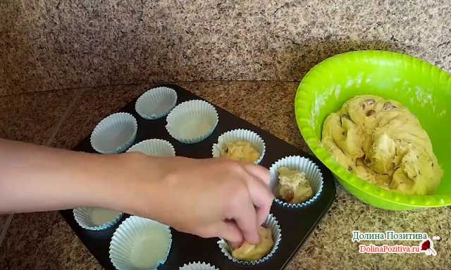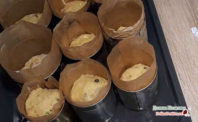 Паперові добре відійдуть і так. Розкладаємо тісто по ємностях, заповнюючи на третю частину. Залишаємо на півгодини під накритий рушником.