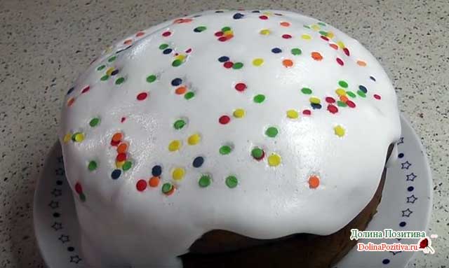 Чекаємо повного остигання паски (приблизно 60 хв.). Покриваємо верх глазур’ю і посипаємо кондитерським конфетті.