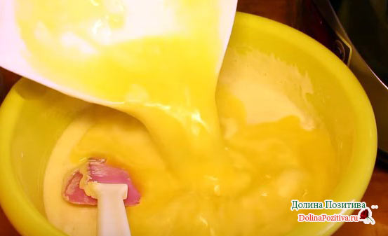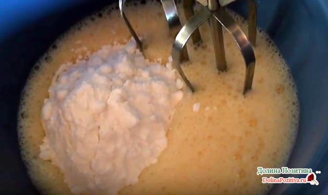 В окремій ємності збиваємо яйця в піну. Додаємо пудру і знову збиваємо на високій швидкості до тих пір, поки маса не стане однорідною.