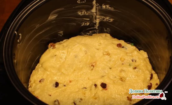 Родзинки підсушуємо на паперовому рушнику, вводимо в тісто і знову все збиваємо. Отриманий заміс відправляємо в форму для запікання, яку попередньо змащуємо рослинним маслом. Ємність заповнюємо тільки наполовину, так як маса підніметься.