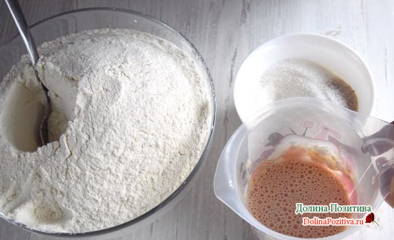 Дріжджі розчиняємо в теплій воді з цукром (2 ст. л.) і залишаємо хвилин на 7. У глибокій мисці з’єднуємо тепле молоко, половину склянки цукрового піску. Все перемішуємо і всипаємо просіяне борошно (2 склянки). Залишаємо, накривши рушником, на 40 хв.
