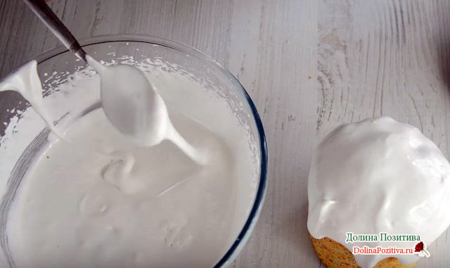 Тим часом займемося глазур’ю. Збиваємо білок 1 хвилину. Вводимо пудру, сік лимона і продовжуємо збивати до густої консистенції. Перевіряємо глазур на стійкість. З віночків крем не повинен стікати.