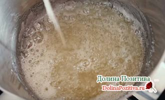 Желатин заливаємо 1 ст. л. води і залишаємо набухати. Цукор додаємо в сотейник, додаємо 2 ст. л. води і ставимо на вогонь. Проварюємо до повного розчинення піску.