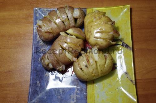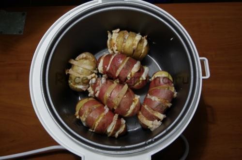 Існує один нюанс, який перетворює просту їжу в кулінарний шедевр — спосіб нарізки картоплі. Якщо ви розрізали її навпіл і клали посередині сало, тепер спробуйте виконати надрізи у вигляді віяла не до кінця (десь 5 на одну картоплину) і між ними розподілити сало. По-перше, картопля пропечеться швидше, по – друге, він рівномірно просочиться жиром зі всіх сторін і буде набагато смачніше.Другий секрет — як різати сало. Покладіть його в морозильник, щоб воно стало твердим, але піддавалося нарізці. Так ви зможете розділити його на тоненькі смужки і сира картопля не розвалиться, коли в неї ви будете закладати свинячий жир. Краще різати сало маленькими шматочками, щоб вони вміщалися в картоплю і не пригоріли під час готування. Налийте столову ложку рослинної олії на дно чаші і викладіть картоплю «на ребро», щоб дна стосувався тільки картопля.