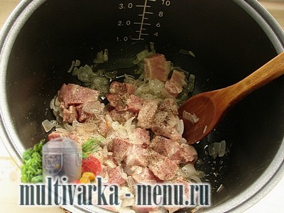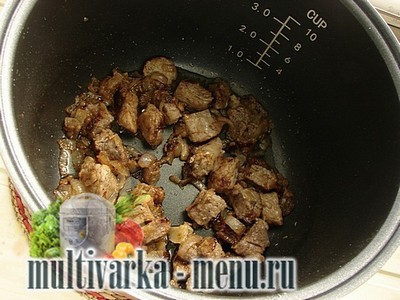 Потім нарізаємо кубиками середнього розміру м’ясо. Викладаємо його в чашу мультиварки. Включаємо режим Смаження і обсмажуємо хвилин 10, періодично помішуючи.