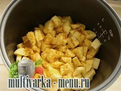 Посипаємо його спеціями. Я додала крім солі і перцю ще і каррі. Можна використовувати спеції для картоплі чи м’яса. Далі заливаємо невеликою кількістю води. Це близько двох мультистаканов. Вона не повинна покривати всю картоплю, а лише злегка просвічуватися крізь вміст чаші. Встановлюємо режим Гасіння 1 годину.