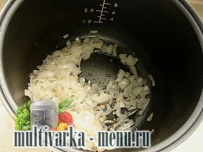 Смаження картоплі в мультиварці – справа проста. Залишилось лише з’єднати м’ясо з картоплею і отримати відмінну страву. Давайте спочатку цибулю наріжемо дрібними кубиками і обсмажимо до золотистого відтінку на режимі Смаження.