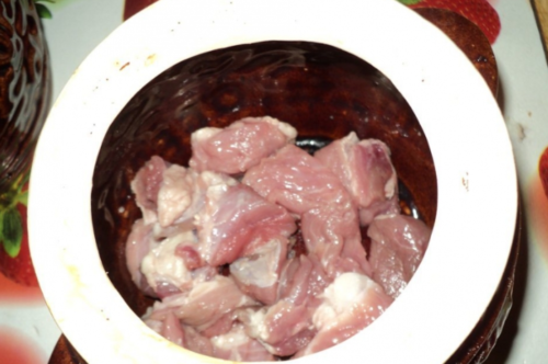- Баранину промиваємо та нарізаємо шматочками по 5-6 см, солимо, перчимо, розкладаємо по приготованим горщикам.
