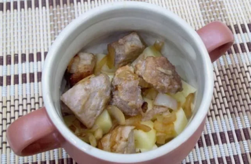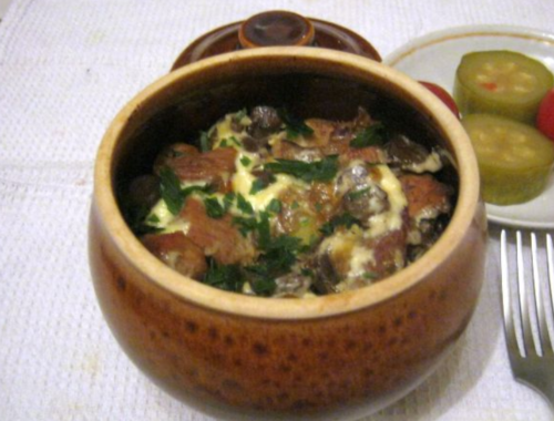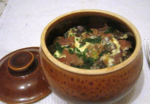 Готову печеню в горщиках з м’ясом і картоплею, подаємо відразу «з пилу, з жару», поставивши їх на порційні тарілки.