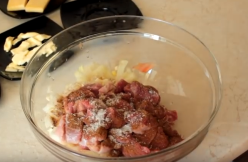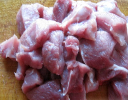 - Отже, свинину нарізаємо кубиками по 3-4 см, складаємо в ємність, солимо і перчимо, залишаємо на півгодини, щоб м’ясо почало виділяти сік.