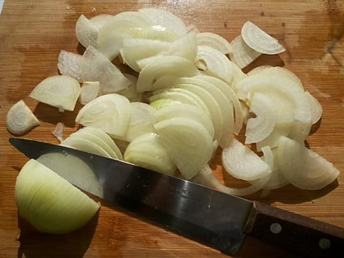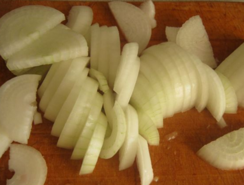 - Цибулю нарізаємо тонкими півкільцями, його ми в горщики будемо класти в свіжому вигляді.