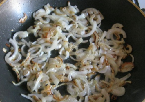 - Половину підготовленого лука викладаємо на розігріту сковорідку з двома столовими ложками олії.