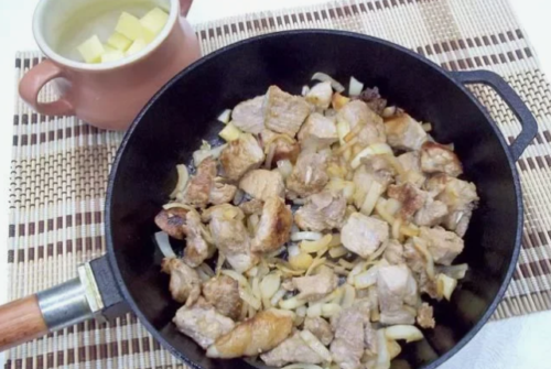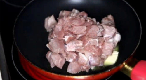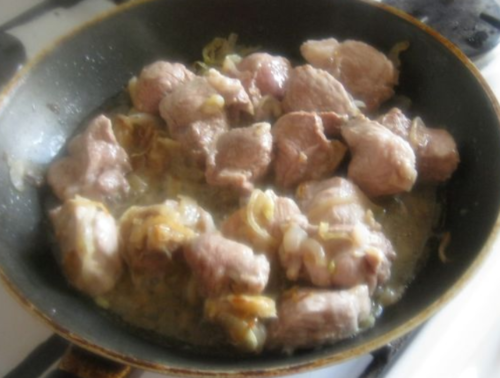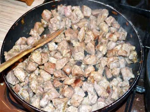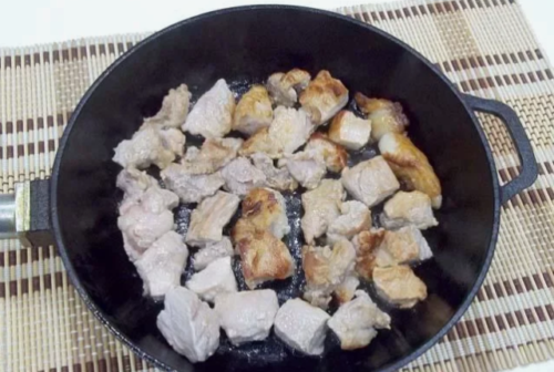 - М’ясо нарізаємо шматочками довільної форми, обсмажуємо на сильному вогні в невеликій кількості олії.