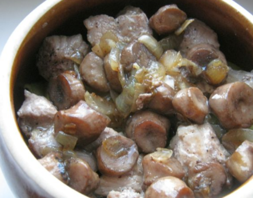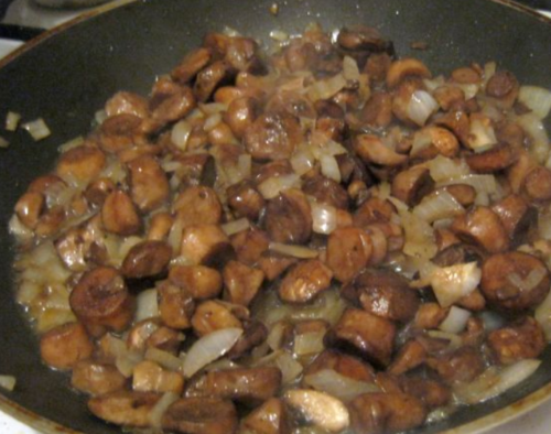 - Поки м’ясо обсмажується, нарізаємо гриби і обсмажуємо їх з рештою цибулею і ложкою рослинного масла. Гриби також солимо і перчимо, обсмажуємо 5 хвилин на сильному вогні.