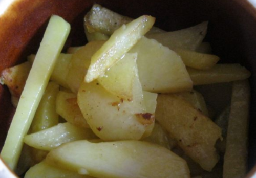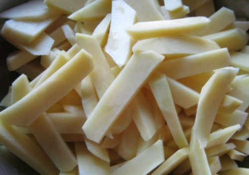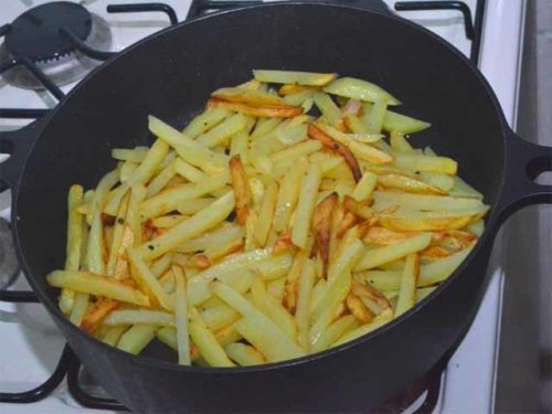 - Картоплю, промивши, очистивши і порізавши соломкою, обсмажуємо до рум’яної скоринки, солимо.