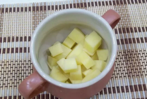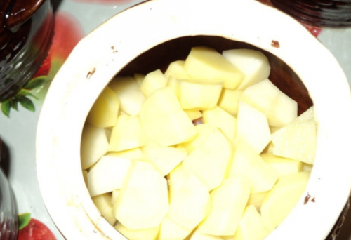 - Картоплю нарізаємо невеликими шматочками, розкладаємо його приготованим горщикам, солимо, перчимо.