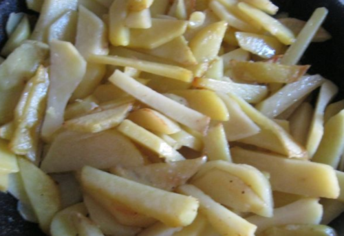 - Очищений і порізаний великою соломкою картоплю також попередньо обсмажуємо з трьома ложками рослинного масла на середньому вогні.