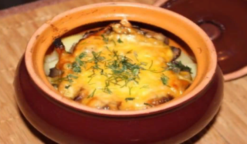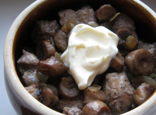 - Спочатку укладаємо картоплю, потім м’ясо з цибулею і зверху гриби з цибулею. У кожен горщик кладемо сметану і ставимо в духовку, розігріту до 180°С.