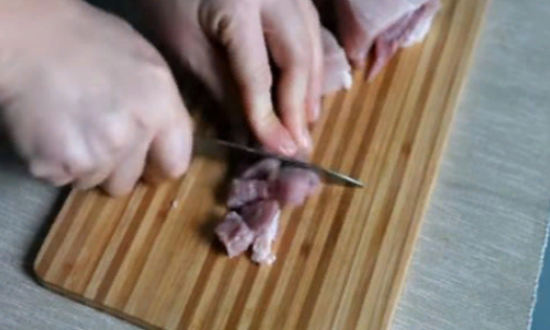 - Отже, нарізаємо м’ясо невеликими шматочками, приблизно по 5 див.