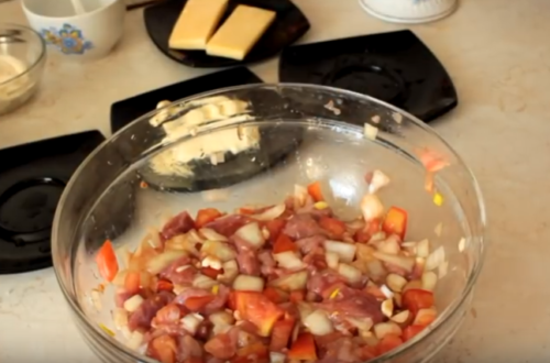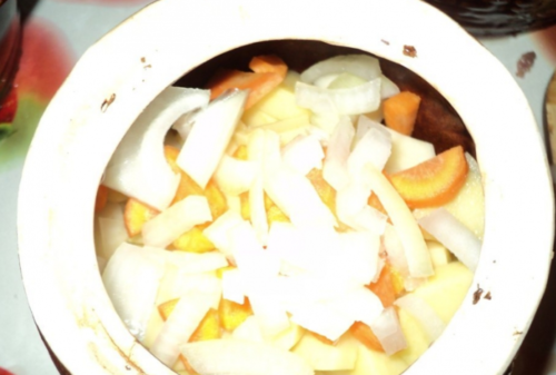 - Розкладаємо підготовлені продукти по горщикам шарами, попередньо налив у них по 2-3 ст. ложки води.