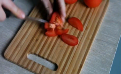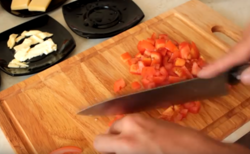 - Тепер залишилося розкласти часточки помідорів зверху, все посолити і поперчити.