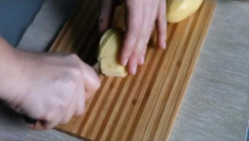 - Тепер готуємо картоплю, промиваємо, очищаємо і нарізаємо тонкими пластинами (так як картоплю кладемо без попередньої термообробки, то крупно його не нарізаємо).