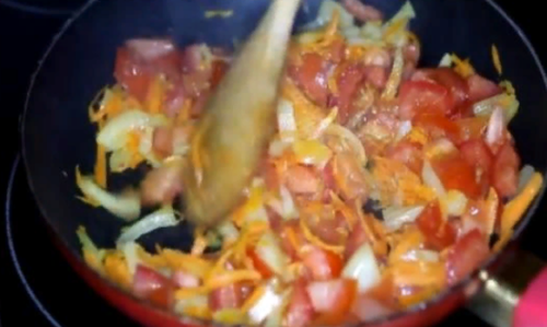 - Додавши трохи олії обсмажуємо овочі до золотистого кольору і додаємо до них скибочки помідор. Продовжуємо тушкувати ще п’ять хвилин, солимо, перчимо.