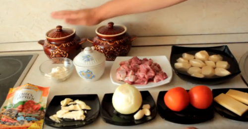 - Розкладаємо м’ясо, картоплю і цибулю з приготованим горщикам, займаємося приготуванням соусу.
