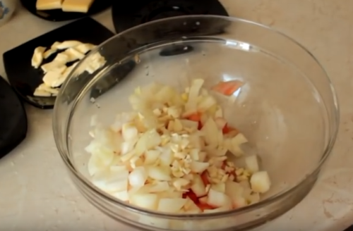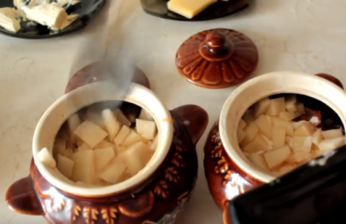 - До цибулі і часнику додаємо вершкове і рослинне масло. Поки перший шар в горщиках злегка пассеруется, викладаємо інші шари.