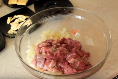 - Далі, викладаємо промаринованное м’ясо, потім, сметану і картоплю, нарізану невеликими кубиками або соломкою.