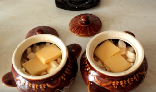 - До потрібного моменту включаємо духовку і розкладаємо по приготованим горщикам вершкове масло.