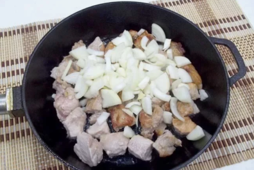 - Обсмажуємо цибулю на сильному вогні пару хвилин і викладаємо підготовлене м’ясо. Обсмажуємо м’ясо з цибулею 10-15 хвилин, збавивши вогонь до середнього. В кінці обсмажування м’ясо солимо і перчимо.