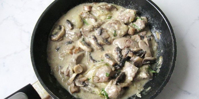 Готувати такий варіант на святковий стіл можна, але частіше він використовується для повсякденного вечері в колі родини. Калорійність продукту не найвища, але страва добре заповнює енергетичний запас організму, дарує відчуття ситості надовго. Маленьким дітям давати гриби не рекомендується, їх можна просто виключити. Нижче наведено варіант, як приготувати курячу печінку зі сметаною з фото.