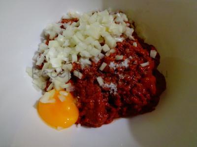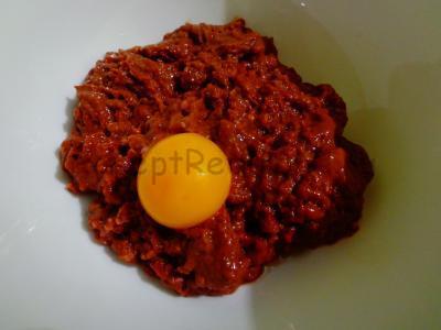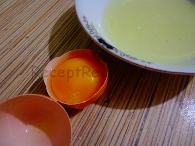 Яйце розбити на дві частини. Акуратно перекладаючи жовток з однієї шкарлупки в іншу, відокремити його від білка (це потрібно, щоб фарш не був надто рідким).