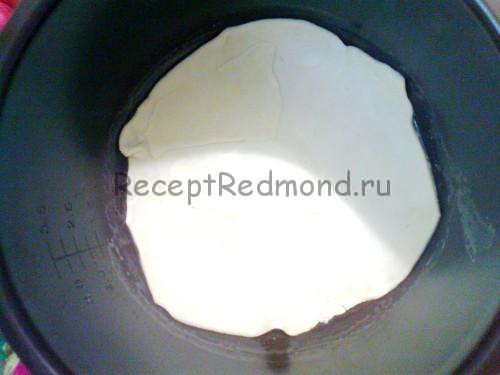 Беремо листкове дріжджове тісто. Однієї пачки вагою 500г вам вистачить на 6 таких міні-піц. Це тісто продається в будь-якому магазині в замороженому вигляді. Воно дуже швидко розморожується — приблизно 20 хвилин в кімнатній температурі. У мікрохвильовій печі можна розморозити за 1 хвилину. Тісто також у вас не пропаде. З нього можна приготувати масу простих і смачних страв. Наприклад, спекти для сім’ї слойки з сиром або з грибами, сосиски в тісті.Тісто треба розкачати, щоб воно збільшилося в довжину і ширину приблизно в два рази. Перш ніж розгортати, качалку і тісто потрібно злегка присипати борошном.Виріжте коло діаметром з чашу вашої мультиварки. Я робила це за допомогою сітки для варіння на пару. Її діаметр ідеально підходить для цих цілей. Потім змастіть чашу вершковим маслом і покладіть тісто на дно мультиварки.