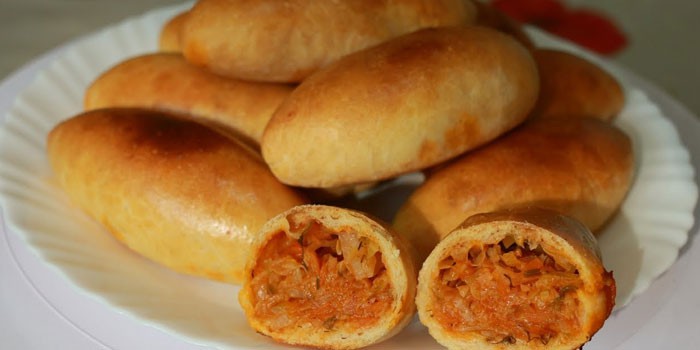 Апетитними і пишними виходять духові пиріжки на дріжджах з капустою, яку змішують для більшої поживності з яйцем і цибулею. Страва добре втамовує голод, насичує організм. Його приємно їсти по вихідних днях або перекушувати на полуденок. Закуска навіть може бути прекрасним сніданком, якщо запивати її теплим молоком, чаєм або кефіром.