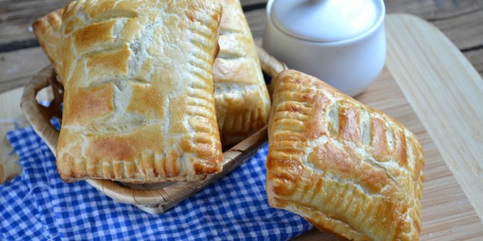 Швидким стравою, не вимагає замішування опари, стануть пиріжки з дріжджового листкового тіста в духовці. Готові листи можна купити в магазині, щоб дістати їх по приходу гостей і здивувати всіх присутніх смачними пирогами, начиненими капустою, грибами та м’ясом. Вийде закуска, чудово насичує організм, відрізняється чудовим ароматом.