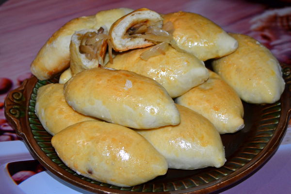 • Тісто розкачати у вигляді круглих соковитою. Зверху на нього викласти трохи начинки і заліпити краї. Під час смаження пиріжків необхідно в першу чергу смажити ту сторону, з якої знаходиться шов.