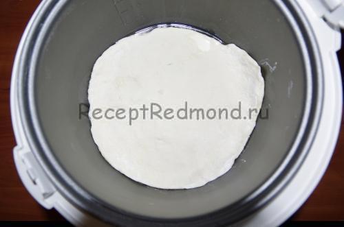 Разморозите тісто і розрівняти його по розміру контейнера. Буває, що воно нерівно розтягується чи порвалося. Якщо тісто листково-дріжджове, його можна згорнути в грудку і розкачати за розміром чаші — на якості здоби це ніяк не позначиться. Налийте рослинне масло і викладіть на дно пласт.