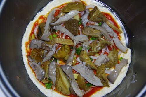 Піца з грибами здивувала мене при першому приготуванні тим, що незважаючи на простоту інгредієнтів, вийшла неймовірно смачною. Єдине, грибів візьміть хоча б два види, сирі і мариновані — вони доповнять один одного. Чаша об’ємом 3 літри нагодує двох осіб. Я використовую листково-дріжджове тісто — в мультиварці Редмонд М4505 випічка вийде повітряної і ніжною.