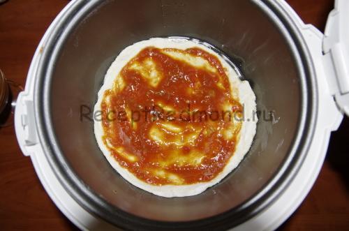 Розмажте томатний соус по поверхні піци. Я намагаюся класти його побільше — так виходить соковитіше і бортик з тіста все одно не дасть йому опинитися зовні.